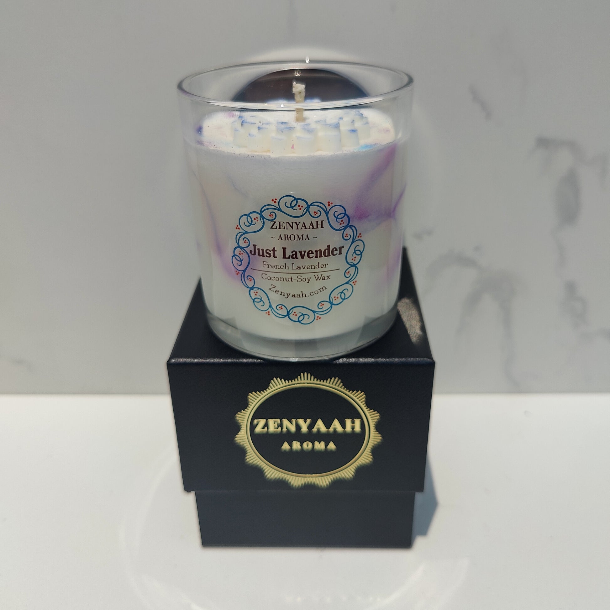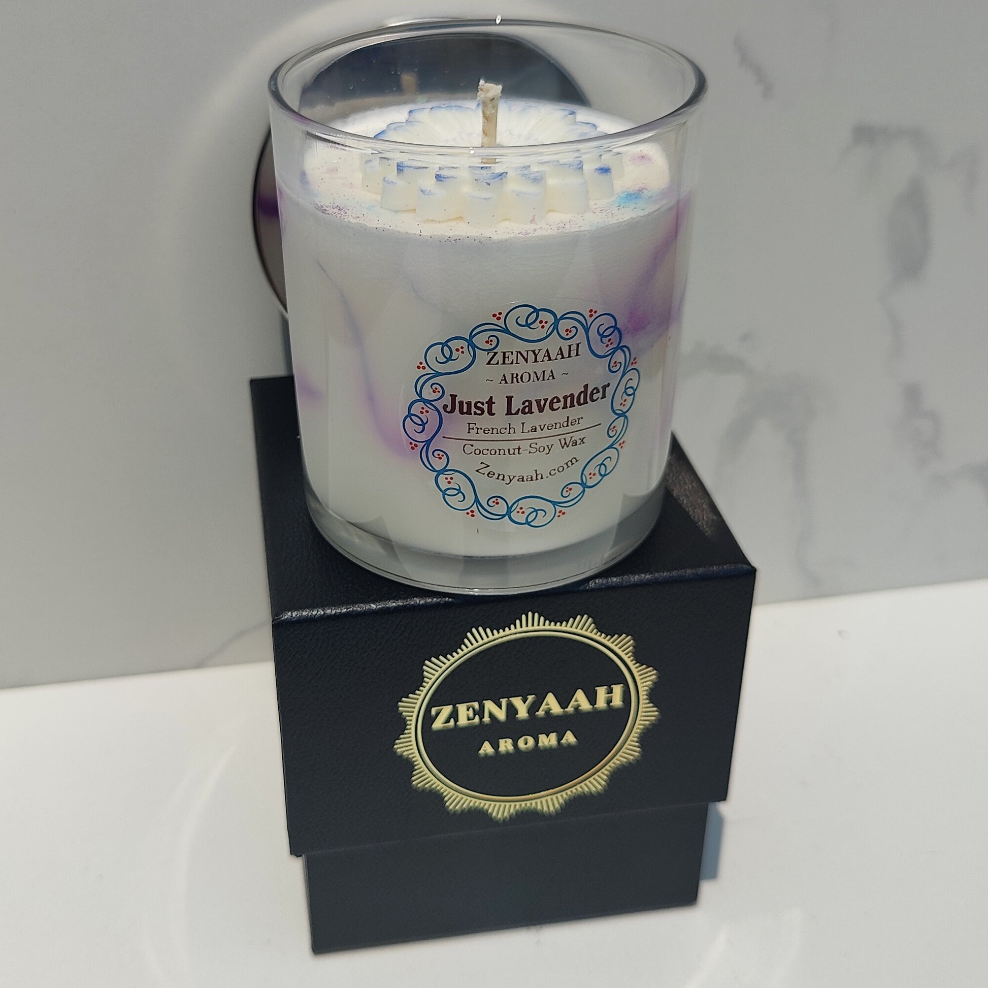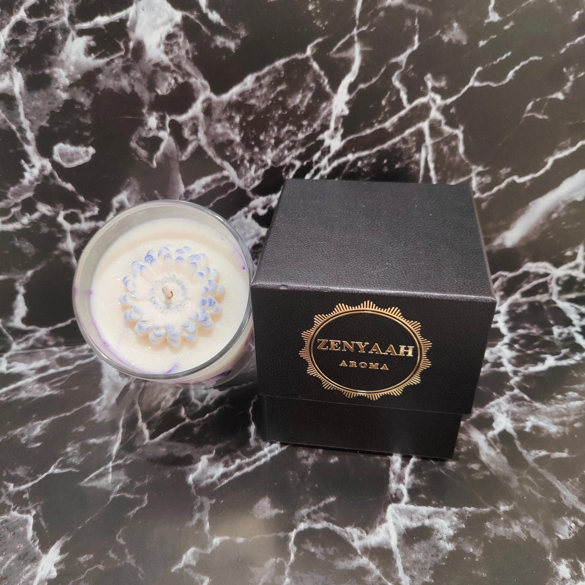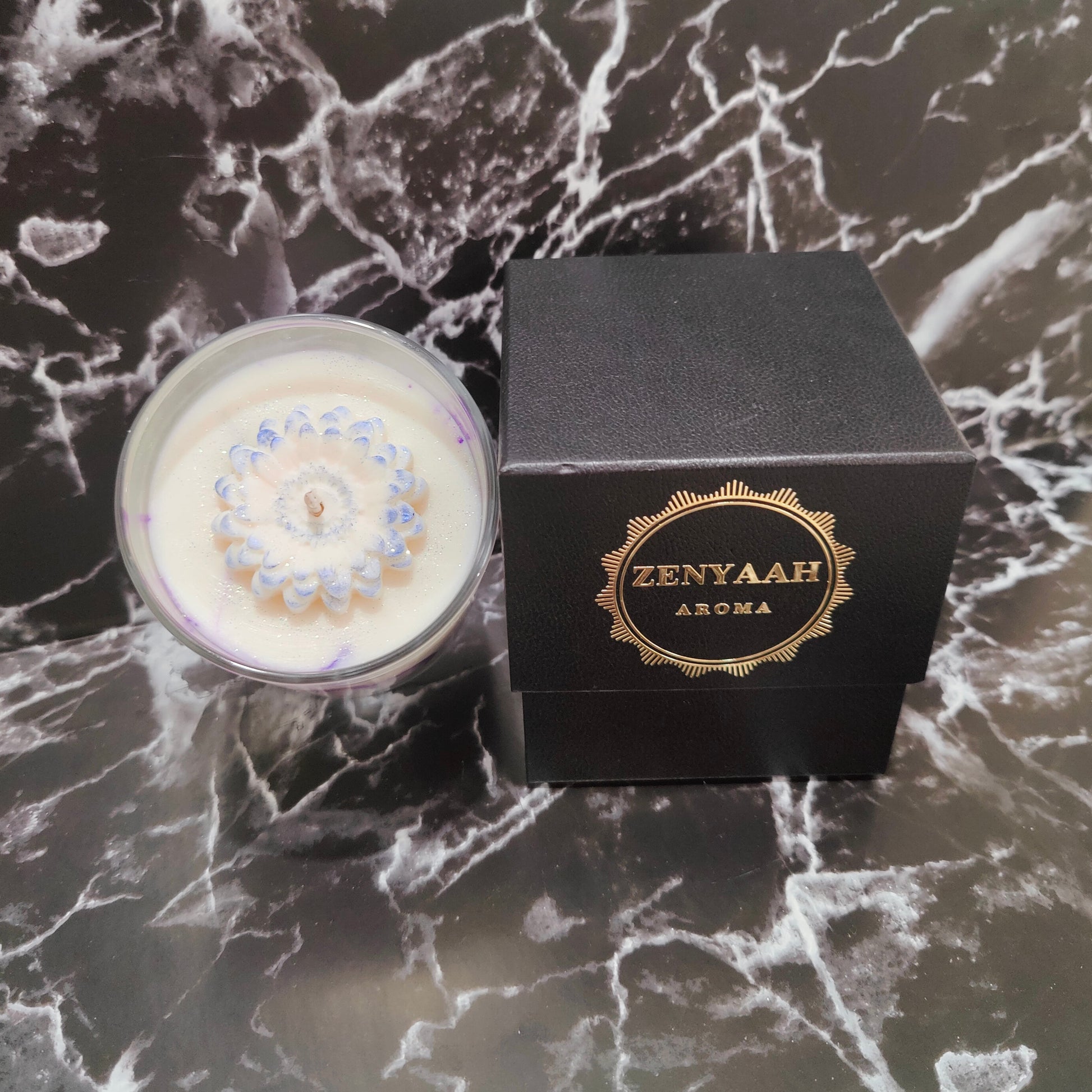 To ensure the highest quality experience, the candle boasts a cotton core wick, providing a clean and even burn that allows you to savor every moment of serenity. Adorned with an artful marbling technique featuring an enchanting shade of purple, this candle is a visual masterpiece that exudes elegance and sophistication. Crowned with a delicate flower complemented by a subtle smidge of glistening glitter on top, it becomes a captivating work of art that enhances any space with its charm.