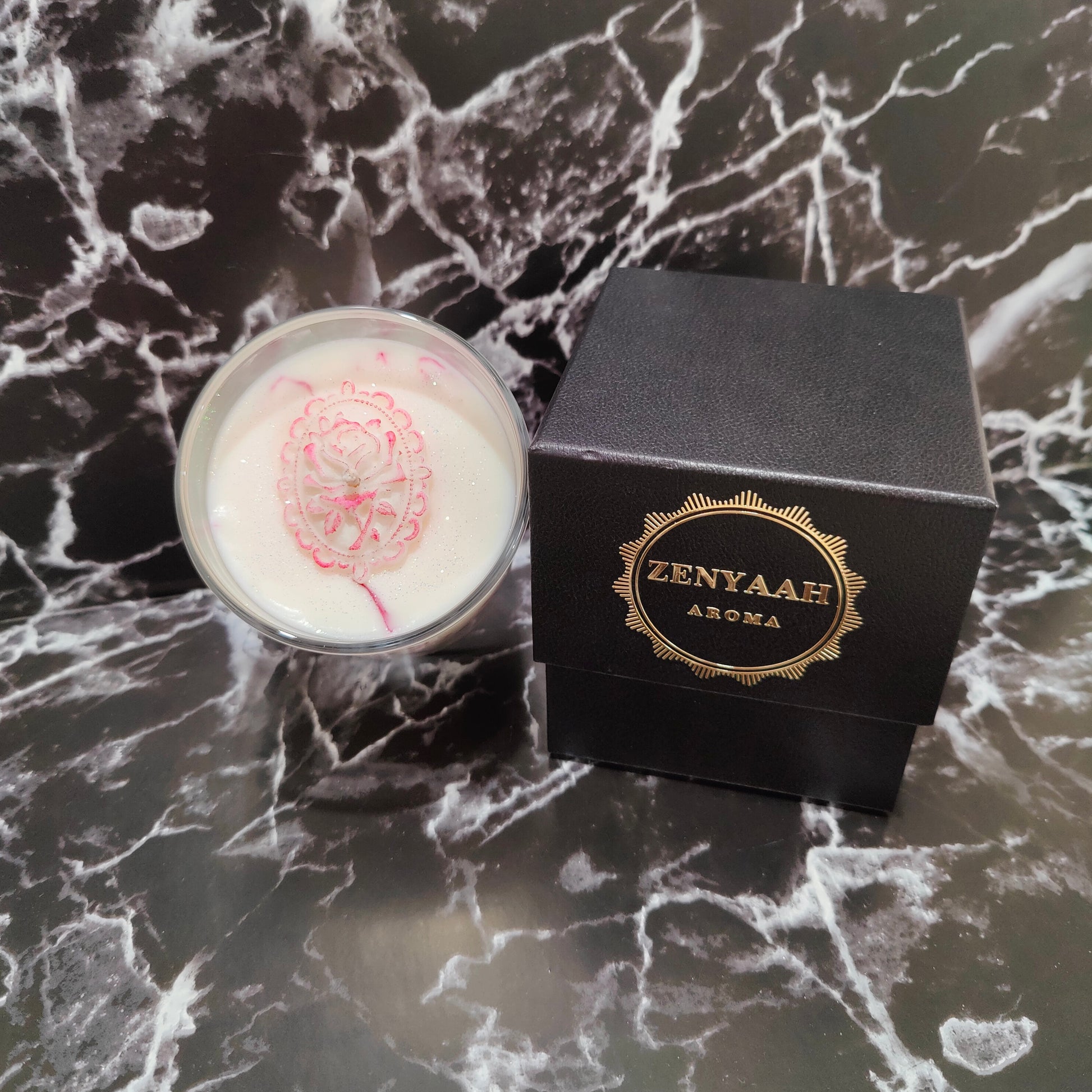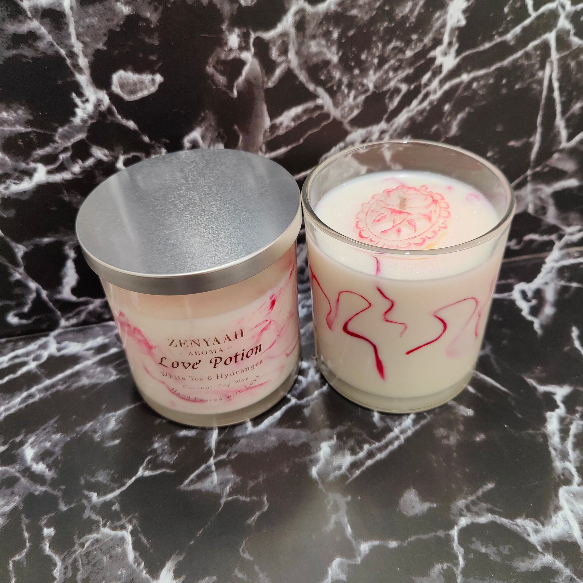 Prepare to be enchanted by its mesmerizing aesthetics! Our candle is meticulously marbled with a delicate touch of pink dye, resulting in a breathtaking visual masterpiece. And to elevate the experience even further, a gentle smidge of glitter delicately graces the candle's surface, adding a touch of sparkle that captivates the eye.