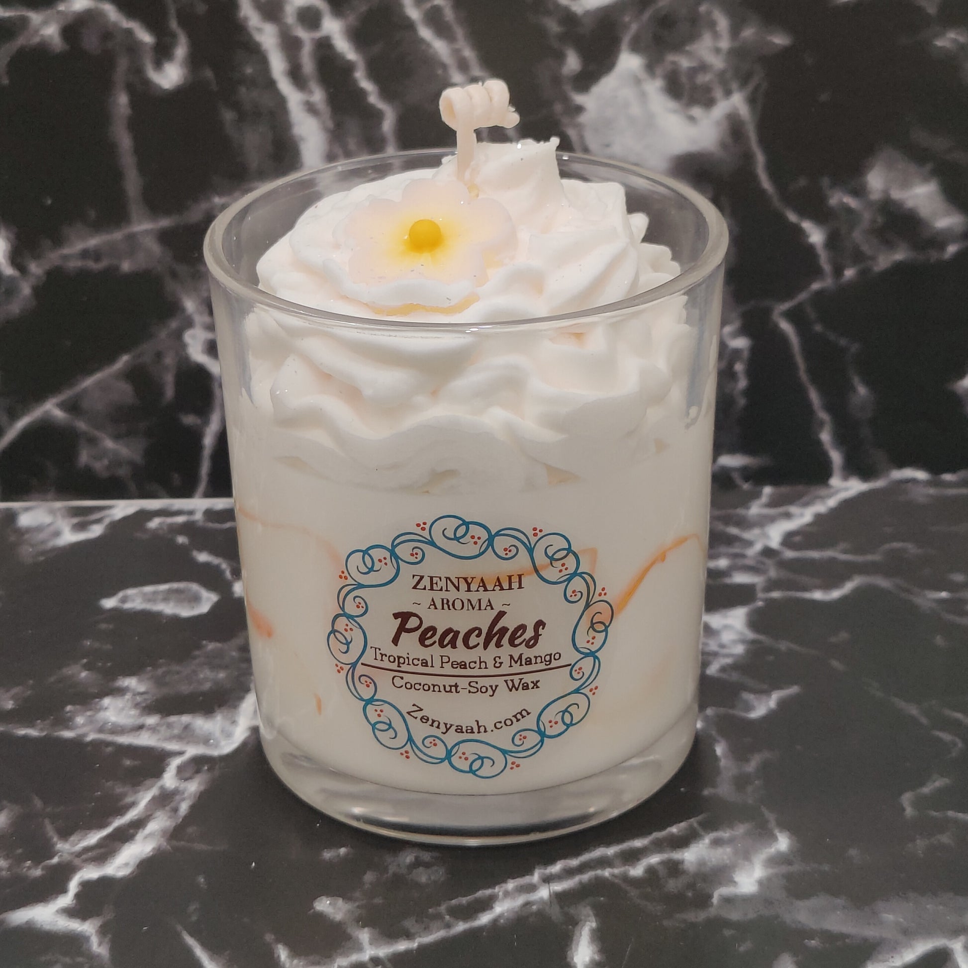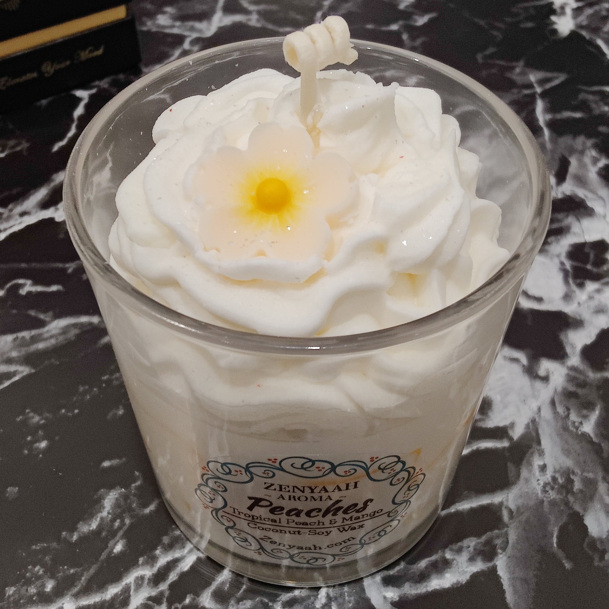 As an extra indulgence, some variations of this candle are adorned with a delightful whipped cream appearance on top, adding a touch of whimsy and charm. Experience the magic of this hand-crafted creation, where nature's finest fragrances and artful design unite to create an irresistible ambiance. Illuminate your space with its captivating glow, as the alluring scents dance in the air, creating a paradise of serenity and delight.