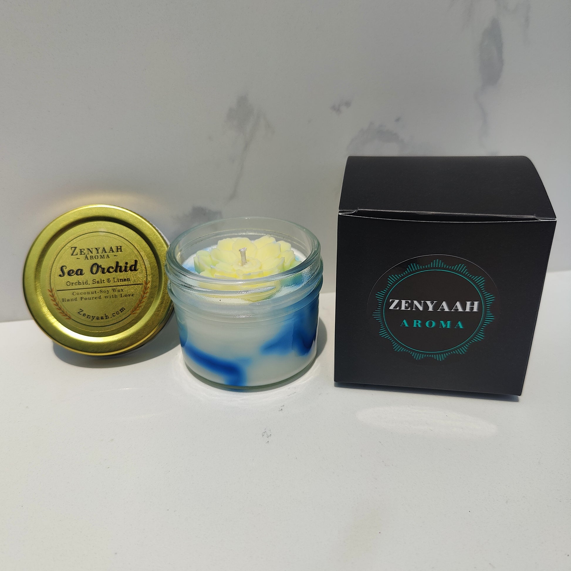 At the heart of our commitment to quality, the candle features a cotton core wick, ensuring a clean and efficient burn that allows you to relish the captivating fragrances without worry. The artistic appeal of the candle doesn't end there! Adorned with an entrancing marbling technique, infused with striking yellow and blue dyes, this masterpiece adds a touch of elegance to any setting. Crowned with a beautiful flower and complemented by a delicate smidge of glistening glitter on top, it becomes a captivating visual delight.