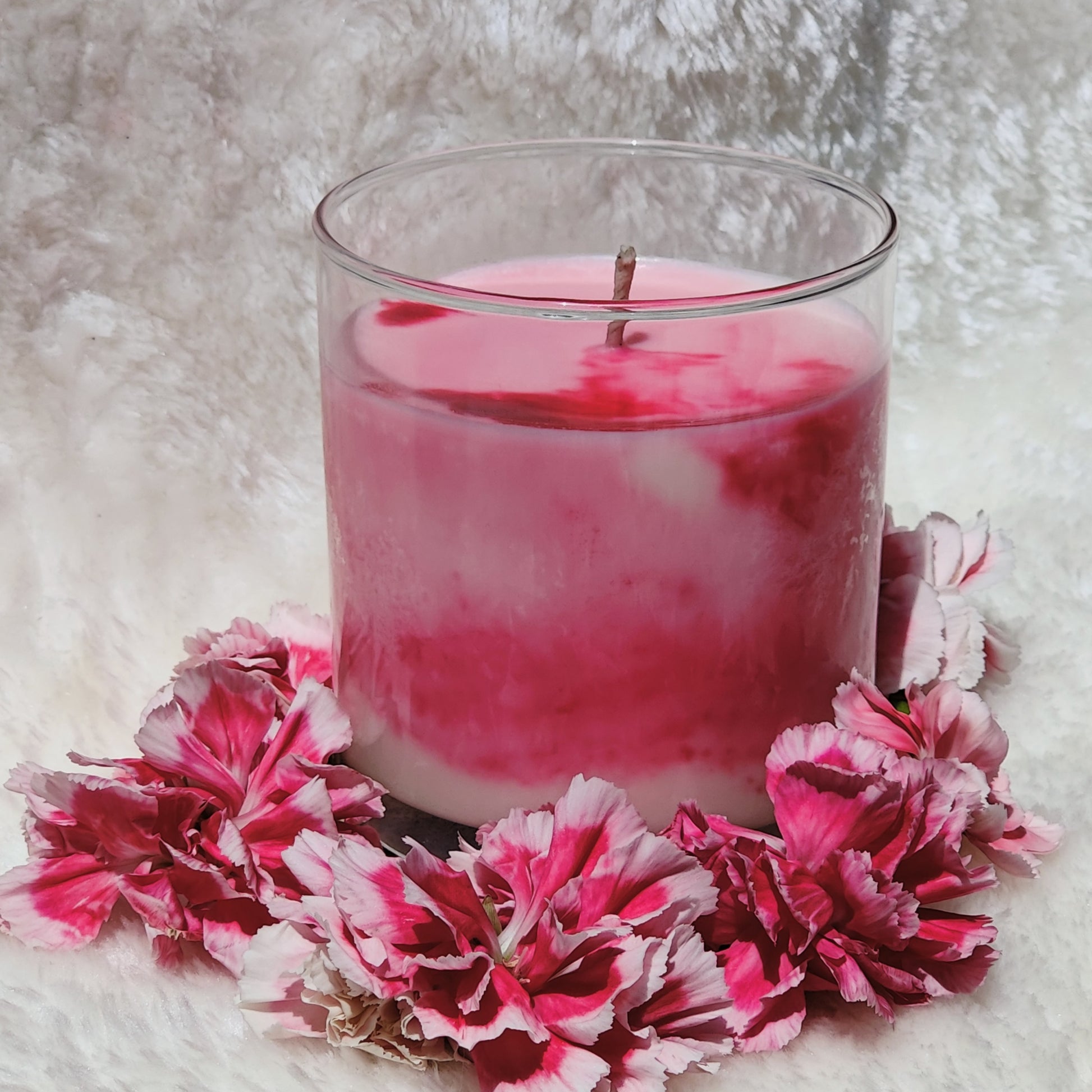 At the heart of our dedication to quality, the candle boasts a cotton core wick, ensuring a clean and efficient burn that allows you to savor the enchanting aromas without a worry. But the allure doesn't end there! Adorned with an enchanting marbled design, brought to life with vivid scarlet and soft pink dyes, this masterpiece adds a touch of elegance to any setting. Crowned with a delicate flower, graced by a subtle smidge of glistening glitter on top, it becomes a captivating visual delight.